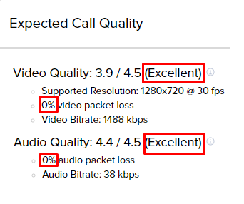 Next, scroll down to the Expected Call Quality Heading. The video and audio quality should be "(Excellent)" and the video and audio packet loss should be 0%.