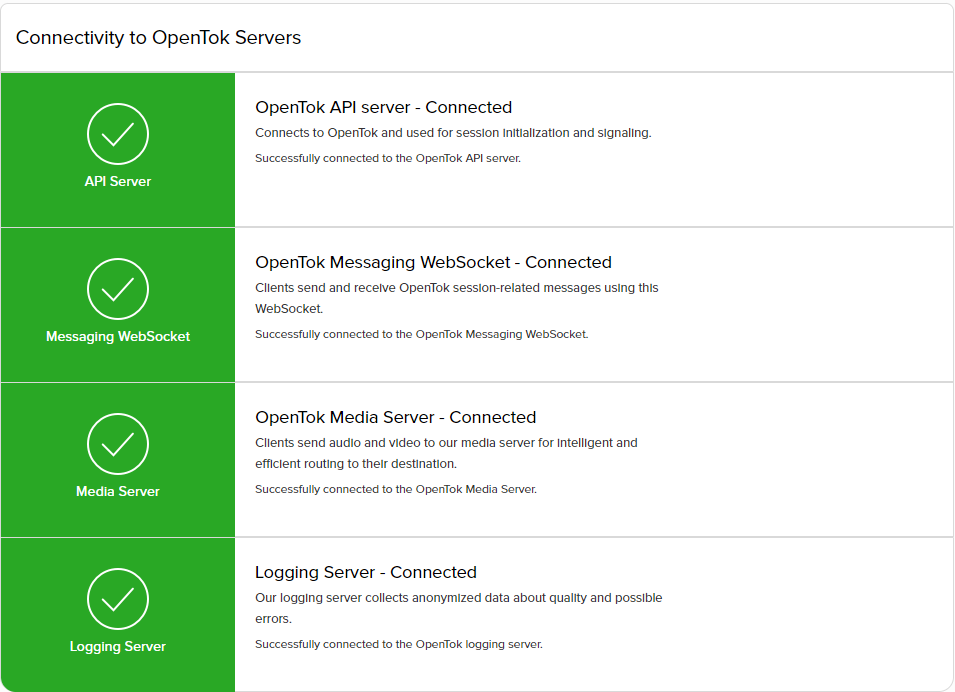 Once the test results are available, scroll down to the Connectivity to OpenTok Servers heading. All four options should have a green check mark.