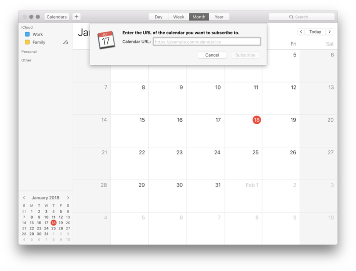 Here are the steps to add your iCalendar URL to the native calendar application on macOS.