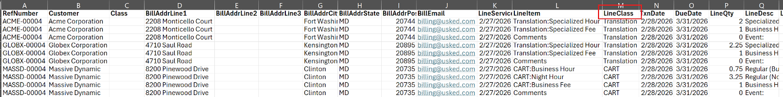 Classes in QuickBooks Online must match the LineClass values in the Usked Invoice Export file before importing customer invoices. If items do not match exactly, invoice imports may fail or create errors.