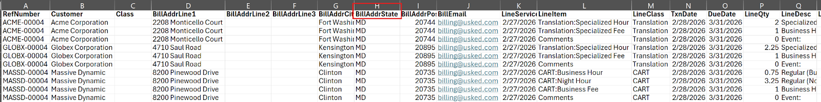 Locations in QuickBooks Online must match the BillAddrState values in the Usked Invoice Export file before importing customer invoices. If items do not match exactly, invoice imports may fail or create errors.