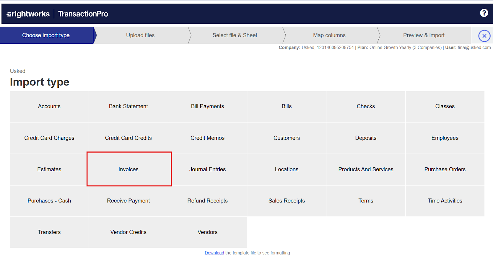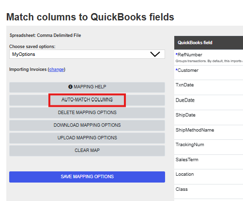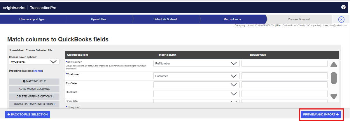 Review QuickBooks Fields and Import columns.