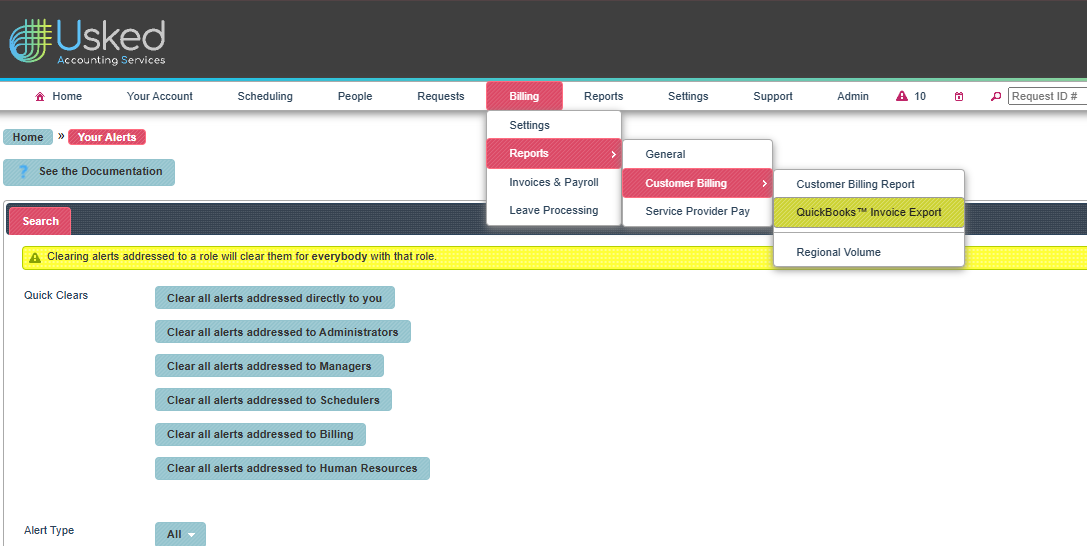 Billing Menu → Reports → Customer Billing → QuickBooks Invoice Export