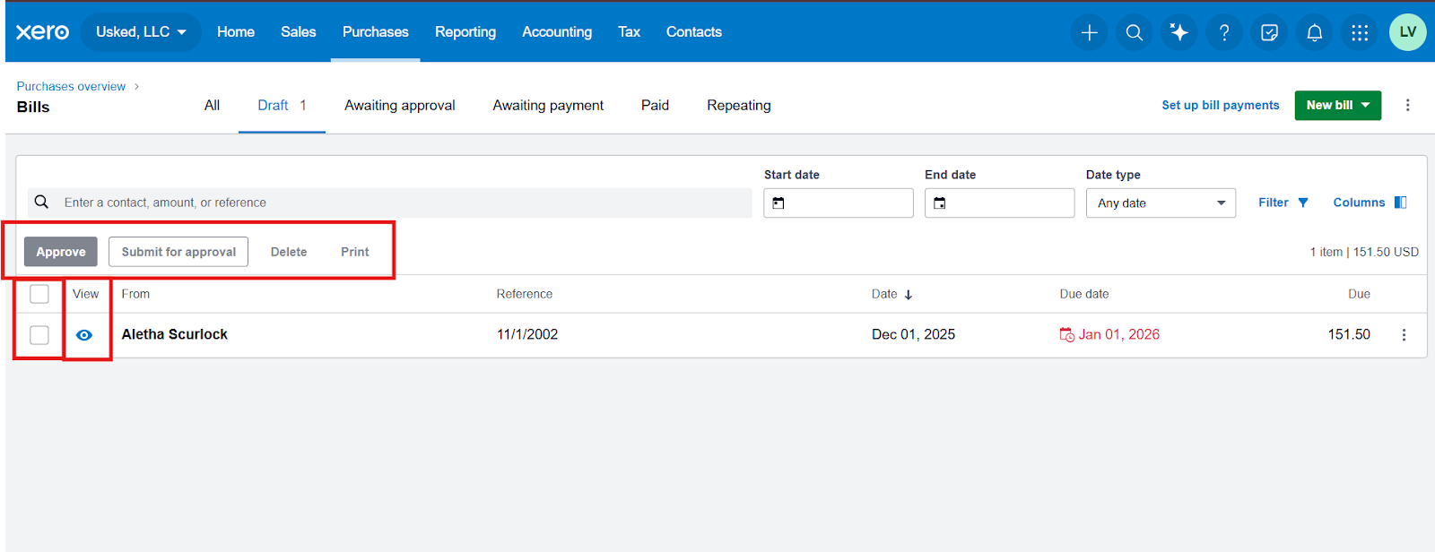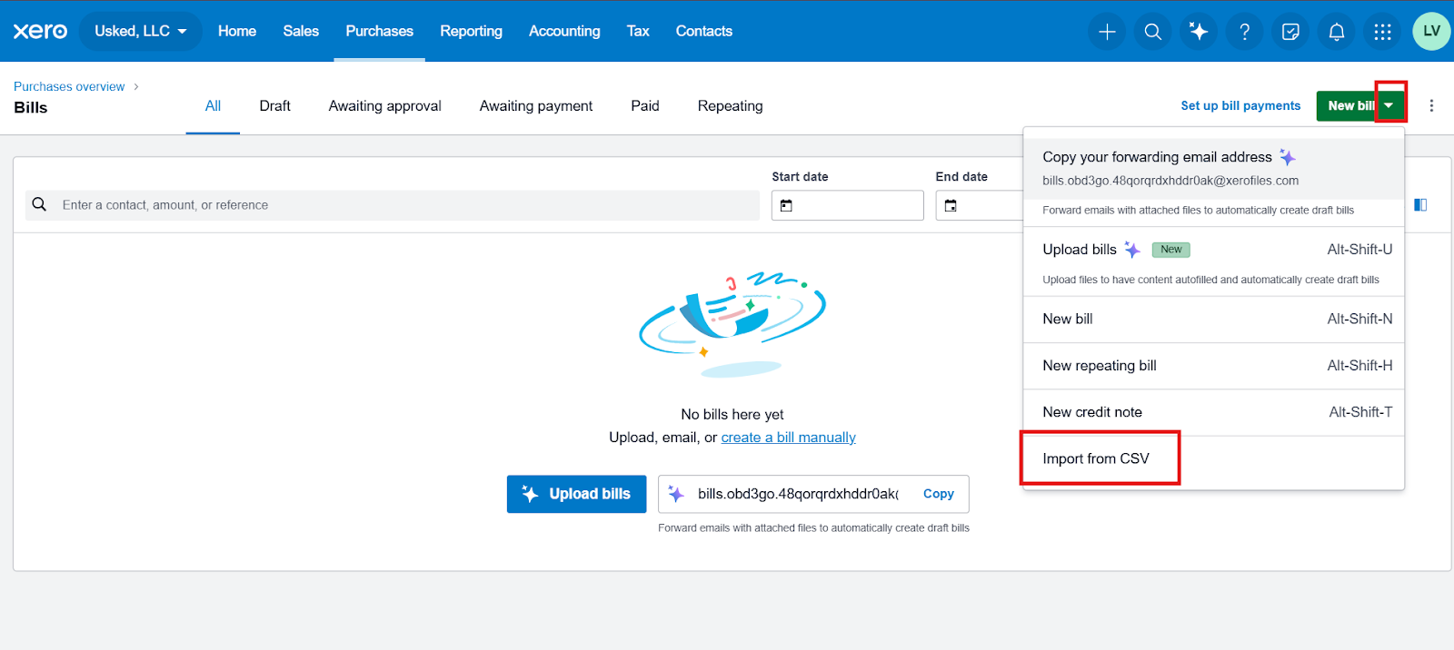 This procedure outlines the steps to export payroll bill data from Usked and import supplier, vendor, and contractor bills into Xero using the bulk CSV import feature.