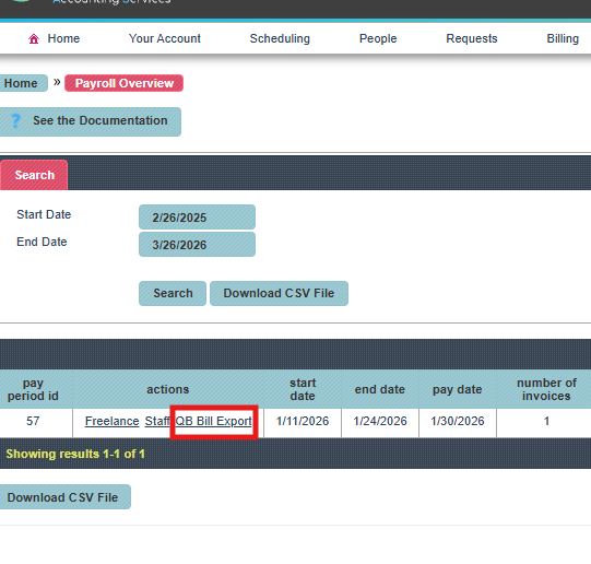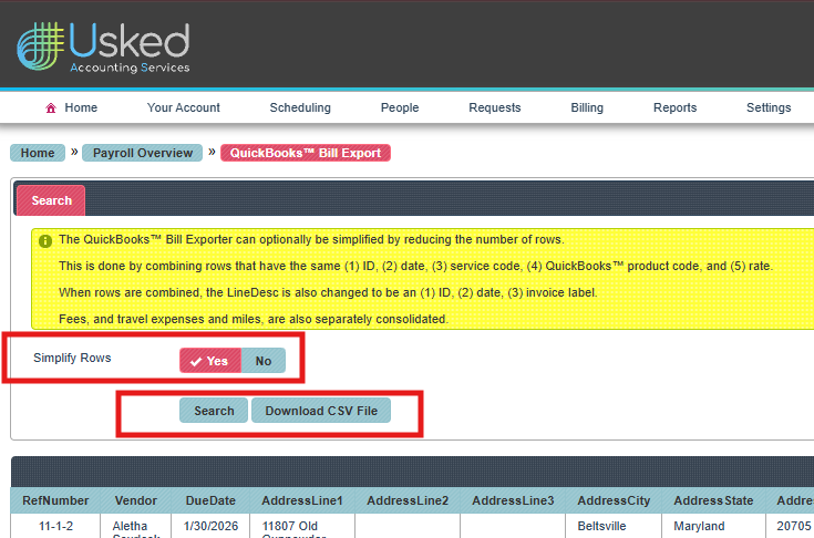Click the QB Bill Export button.