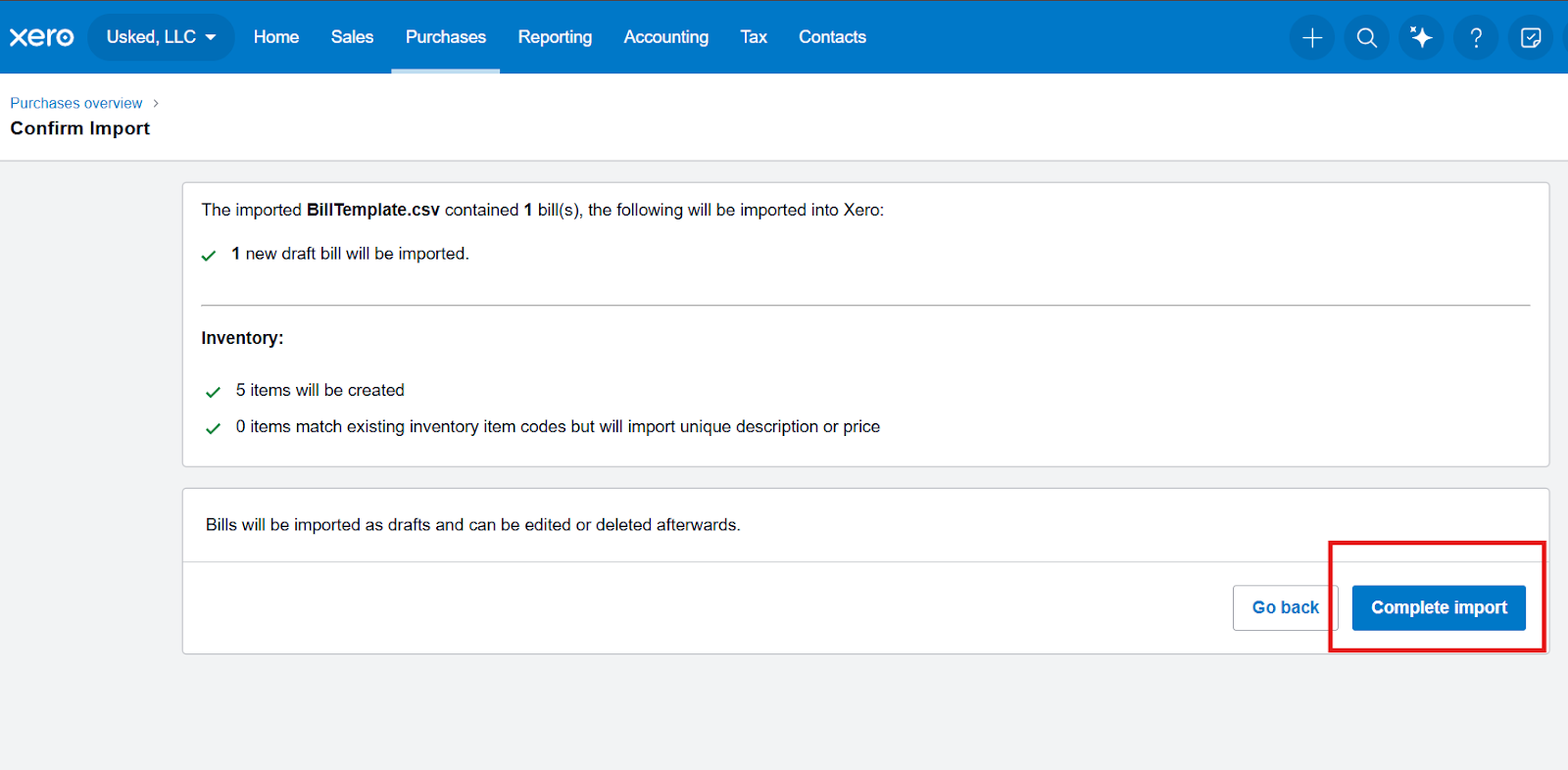 After import, bills will appear in draft status.